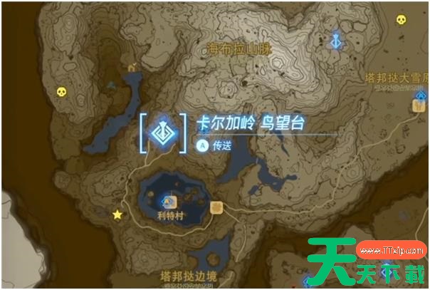 1、传送到地图左上角的卡尔加岭鸟望台,出了神庙往右边走,然后从悬崖上跳下去滑翔,往右前方滑翔,看见河流以后,沿着河流一直往北方飞。