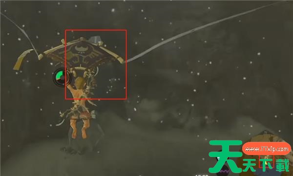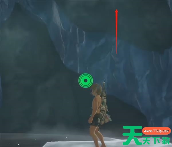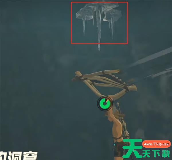 3、然后视角往右上方看,会发现一堆冰刺,在空中用弓箭+炸弹果射它,产生气流以后往它之前的位置飞,进去就能看到暴风雪头的宝箱了。