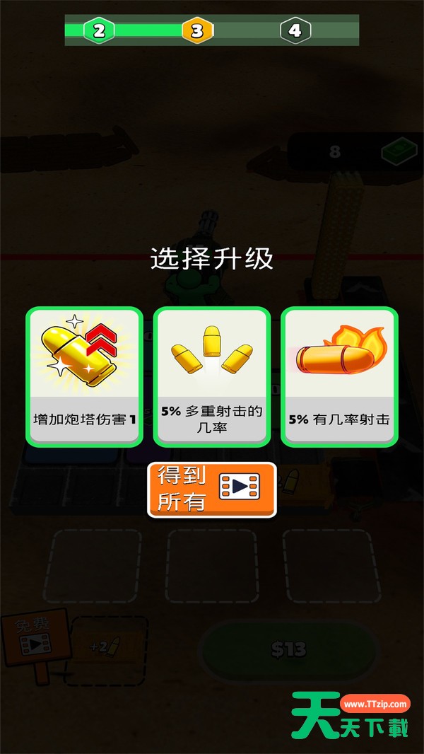 在这款游戏中想要获得更高级别的武器炮塔就需要通过不断合并的方式,在这个过程中你合并得越多子弹也就越大。