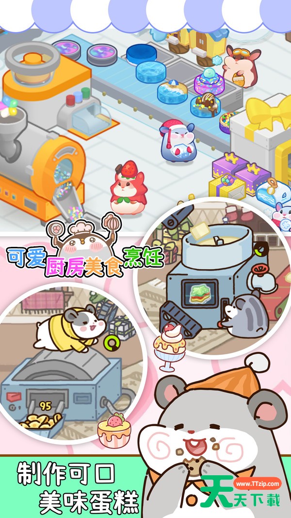 可爱厨房美食烹饪是一款模拟制作美食的小游戏,在这款游戏中你将会拥有一个仓鼠蛋糕工厂,在这里你需要操控小仓鼠们来制作各种蛋糕美食,感兴趣的小伙伴快来天天下载资源网游戏体验试试看吧。