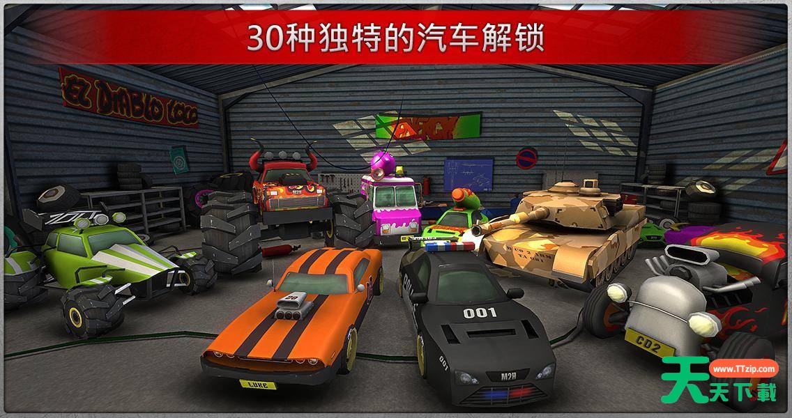 2.非凡Crash Drive 3D的续篇! 在车库选车,然后准备体验超级好玩的自由驰骋。