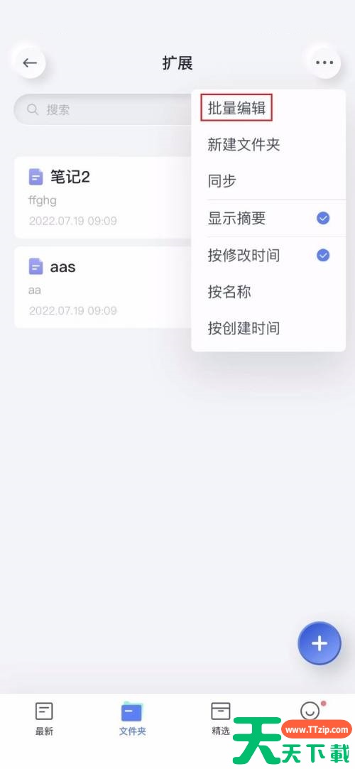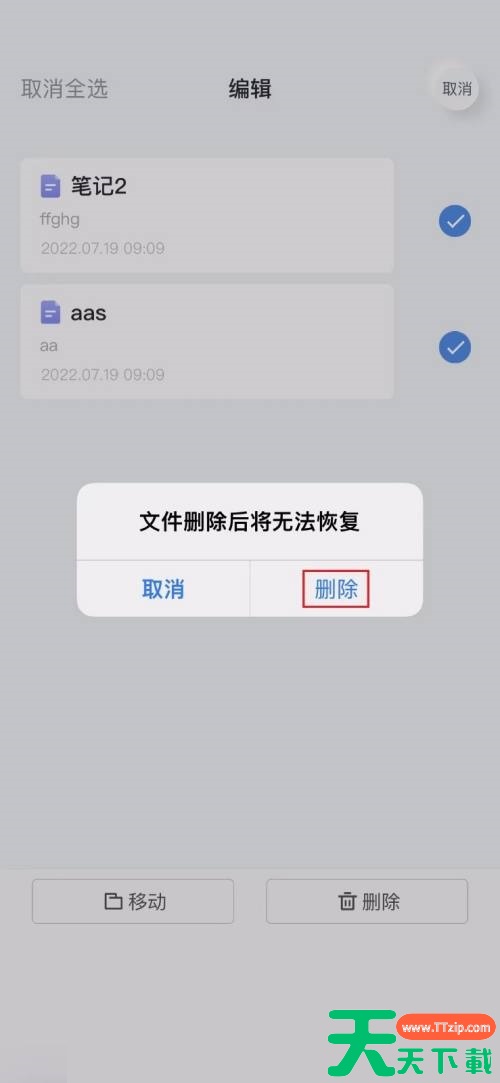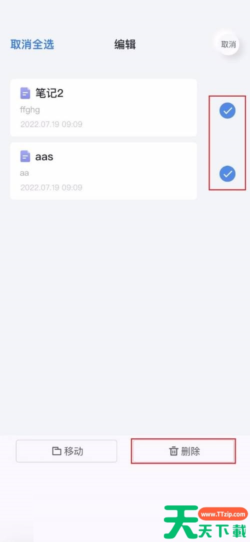 有的小伙伴会问天天下载有道云笔记怎么批量删除笔记,下面天天下载就为大家详细的介绍一下,想知道的话就来看看吧,相信一定会帮到你们的。有道云笔记怎么批量删除笔记?有道云笔记批量删除笔记教程 1、首先打开有道云笔记界面,点击右上角的设置图标。2、然后在弹出的菜单中,点击批量编辑。3、进入批量编辑界面,勾选要删除的笔记,点击删除图标。4、接着弹出确认删除的窗口,点击删除。5、最后返回笔记列表界面,看不到笔记内容,说明删除成功了。以上就是有道云笔记怎么批量删除笔记的全部内容,更多手机教程请关注天天下载!@天天下载 除特别注明外,本站所有文章均为 天天下载 原创,转载请注明出处来自 https://www.ttzip.com/120576.html