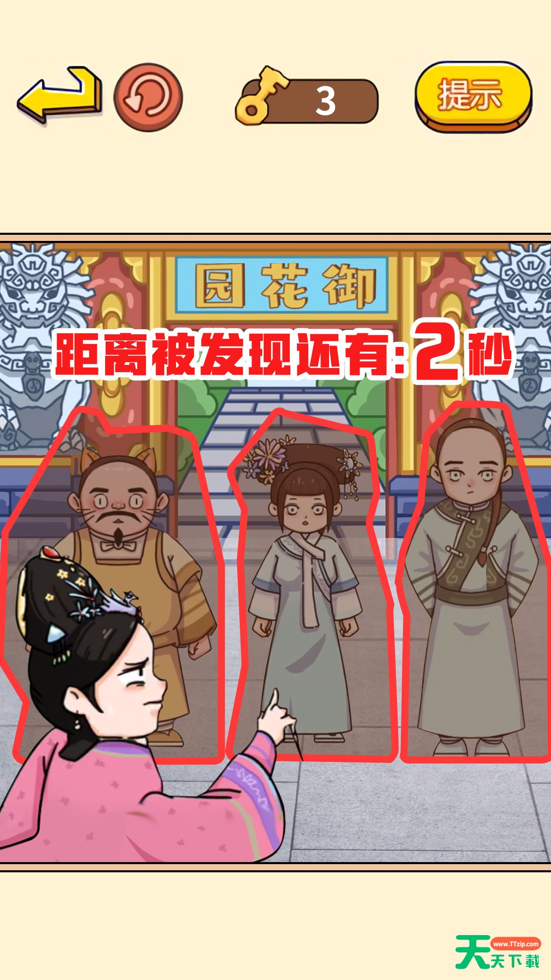 《躲猫猫生存挑战》是一款休闲生存类游戏,游戏中你需要帮助宫中的各种人物摆好对应的姿势来藏到石头后面,以躲避贵妃的寻找,不断的切换动作尝试吧,看看哪一个姿势才是能躲进去的。@天天下载