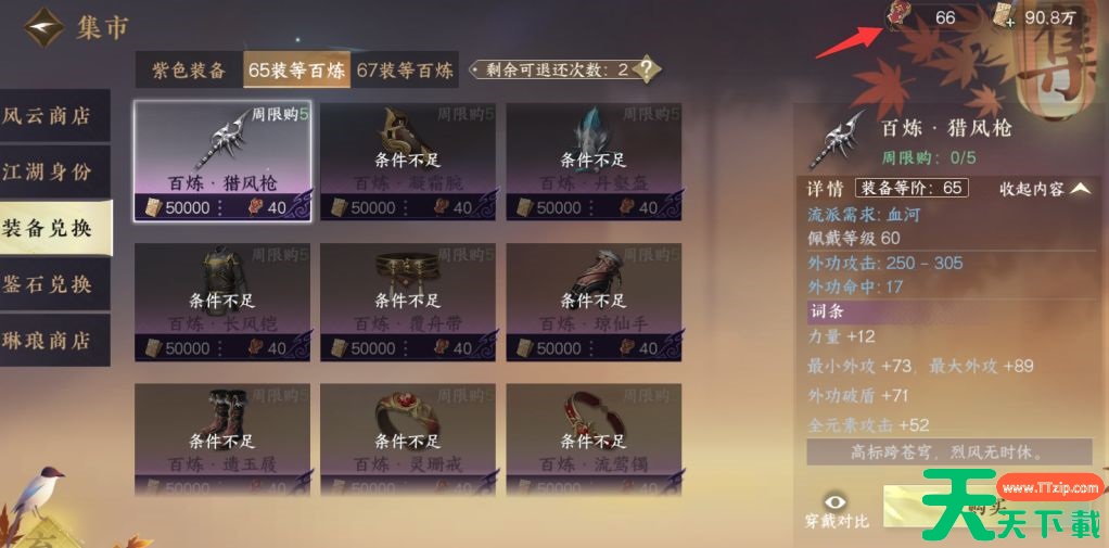 65和67的百炼装备,不着急换等差那么一两件的时候再换,可退还次数就两次,千万不要着急哦~