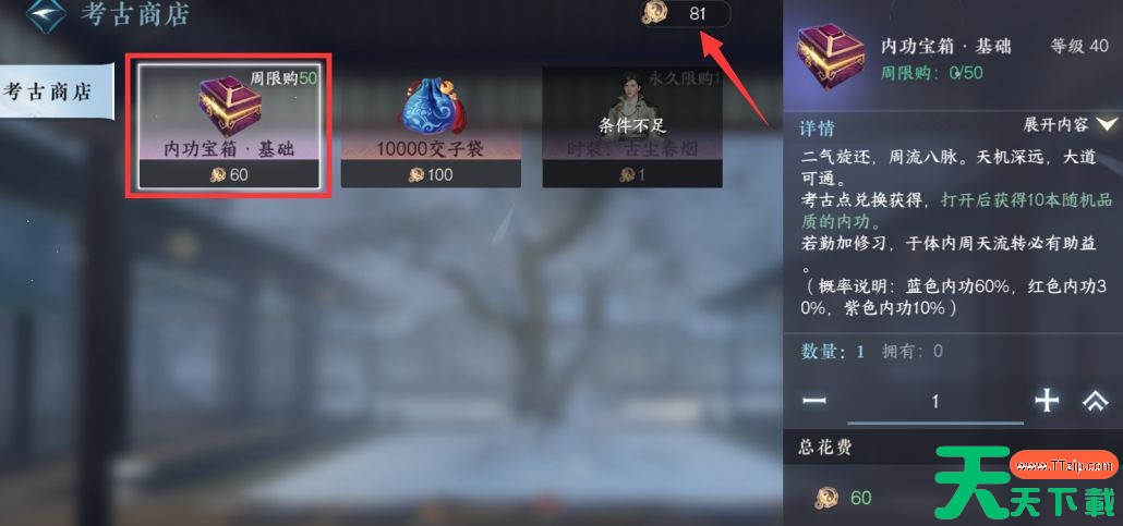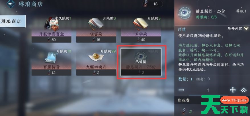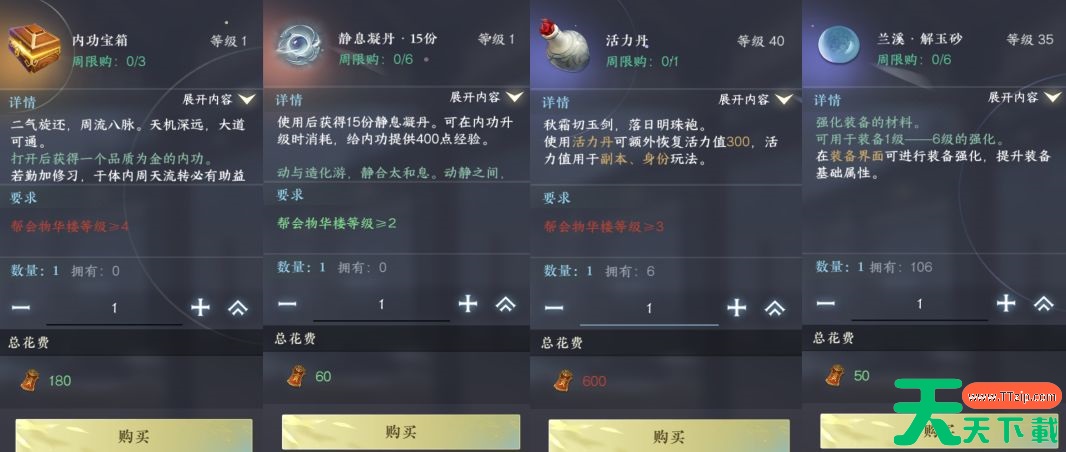 优先内功宝箱,静息凝丹,活力丹剩余的兑换兰溪解玉砂!