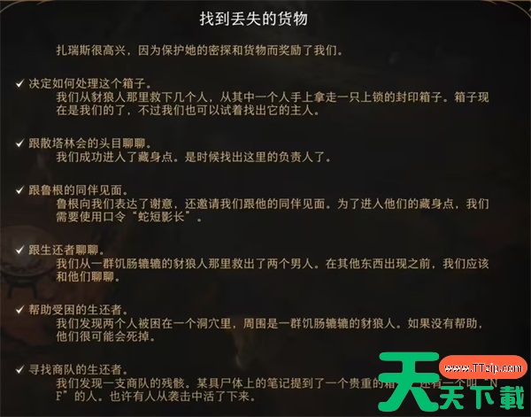 1、找回丢失的货物是博德之门3前期的一个任务。