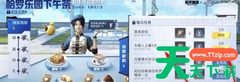 你们是不是和天天下载一样都喜欢玩和平精英游戏呢?那么你们知道和平精英怎样获得食谱吗?接下来,天天下载就为各位带来了和平精英获得食谱的玩法攻略,感兴趣的玩家快来下文看看吧。 和平精英怎样获得食谱?和平精英获得食谱的玩法攻略 打开和平精英,进入游戏界面,点击“活动”选项进入。 进入之后,选择“守护之章兑永久枪皮”,然后点击【恩槐新前往】进入。 点击“哈罗下午茶”选项。霜宋 然后完成每日任务界面中的任伟祝务,点击“领取”按钮。 OK,成功获得食谱了。 谢谢各位朋友的阅读观看和平精英获得食谱的玩法攻略,更多精彩攻略请关注天天下载! @天天下载 除特别注明外,本站所有文章均为 天天下载 原创,转载请注明出处来自 https://www.ttzip.com/144386.html