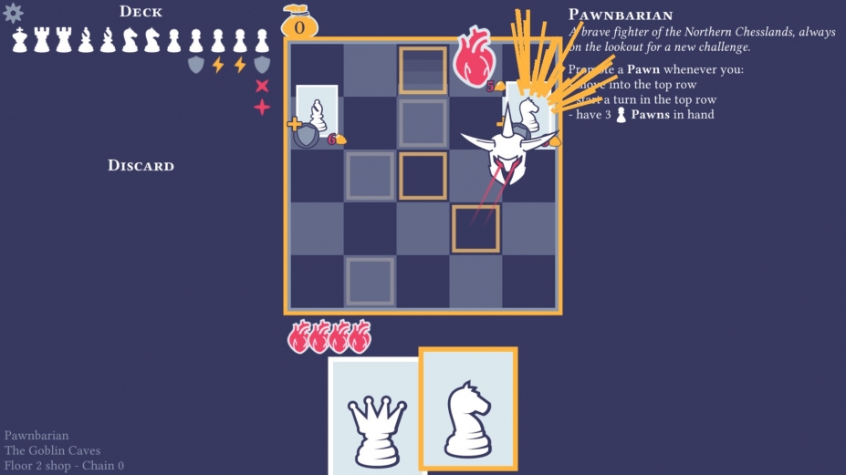 瓦里安走卒(Pawnbarian)是一款极简主义风格的益智类roguelike地牢闯关游戏,它通过使用国际象棋移动来控制您的冒险家在一个地牢棋盘上清除怪物。使用你的棋子进行砍杀,通过金币来升级你的棋子,征服3个充满各种怪物的地牢。