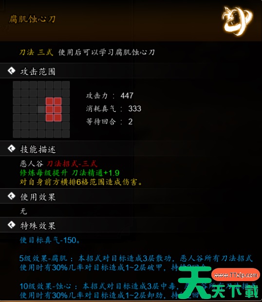 10级效果-蚀心:这个招式是能对目标造成3层中毒效果,还有1~2层卸劲,持续2回合。