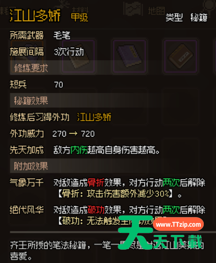 大侠立志传甲级笔法秘籍都有哪些呢?还有部分玩家不知道,下面给大家带来的是大侠立志传甲级笔法秘籍属性大全。 大侠立志传甲级笔法秘籍属性大全 千里江山图 江山多娇 目前版本拥有以上笔法秘籍,希望对大家有所帮助。@天天下载 除特别注明外,本站所有文章均为 天天下载 原创,转载请注明出处来自 https://www.ttzip.com/16112.html