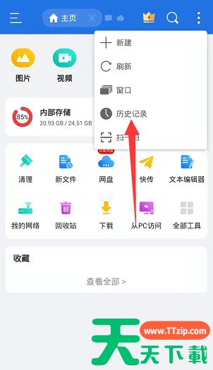 很多小伙伴不知道ES文件浏览器如何清除历史记录,所以下面天天下载软件站就分享了ES文件浏览器清除历史记录的方法,一起跟着天天下载软件站来看看吧,相信对大家会有帮助。ES文件浏览器如何清除历史记录?ES文件浏览器清除历史记录的方法1、首先打开ES文件浏览器进入首页,点击右上角的三个小点图标,如下图所示。2、然后在弹出的弹窗中点击历史记录选项,如下图所示。3、最后点击历史记录页面下方的清除按钮即可,如下图所示。上面就是天天下载软件站为大家带来的ES文件浏览器如何清除历史记录的全部内容,更多手机教程尽在天天下载。@天天下载 除特别注明外,本站所有文章均为 天天下载 原创,转载请注明出处来自 https://www.ttzip.com/172626.html