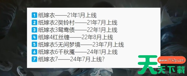 4、根据「纸嫁衣」系列一贯的上线规律来看,《纸嫁衣7》在今年暑期上线应该是没什么问题的,AppStore上的预计时间也可以证实;