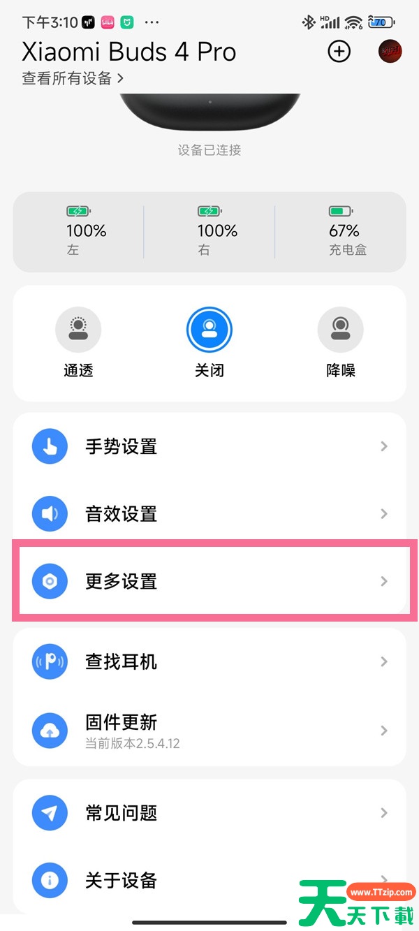 1、从小米耳机app进入小米buds4pro,点击【更多设置】。