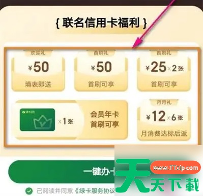 在进入的页面里“联名信用卡福利”下方可以查看到信用卡福利,点击勾选底部的服务协议和授权协议,并点击“一键办卡”。