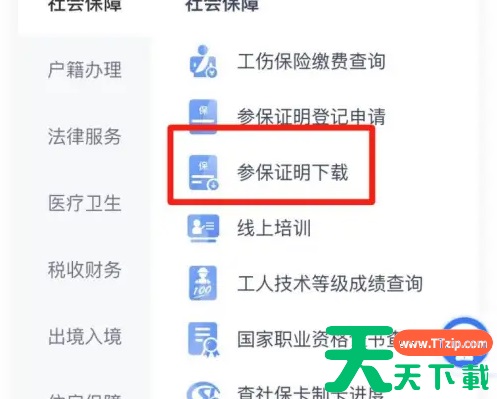 第一步:打开【三晋通】APP,点击【服务】。 第二步:在个人服务页面点击【参保证明下载】。 第三步:最后在新页面点击【失业保险在职参保证明】即可下载。 @天天下载 除特别注明外,本站所有文章均为 天天下载 原创,转载请注明出处来自 https://www.ttzip.com/178069.html
