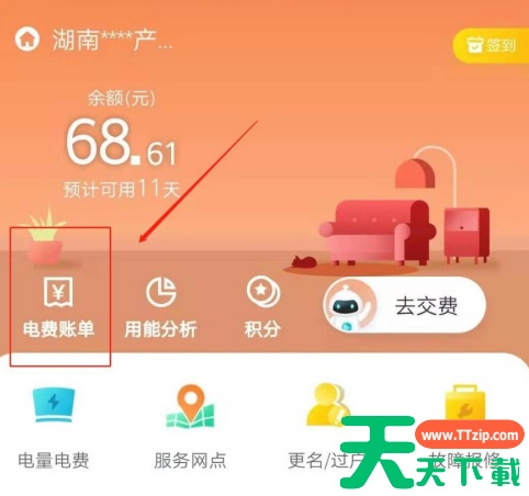 登录成功后,进入首界面,在电费余额下点击电费账单图标;