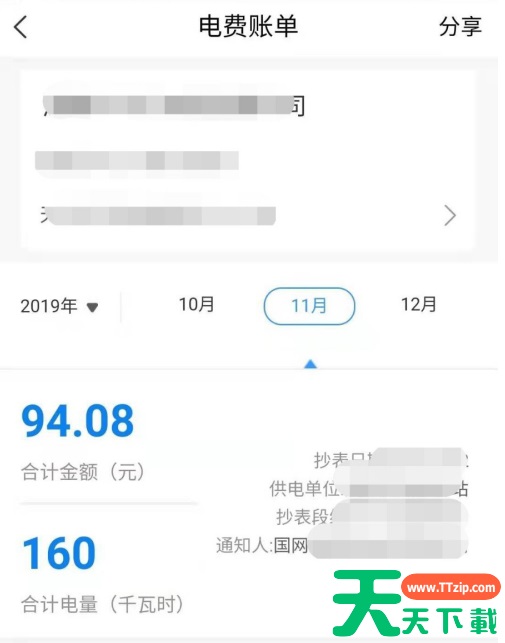 tips:显示抄表日期、度数、费用以及供电单位 、用电阶梯等级;