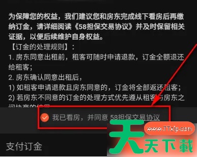 打开58同城,点击右下角我的图标英没。 在我的租房处,速册点击右侧更多。 点击聊天找房。 点击下方交定金。 勾选我已看房。 点获肥罪击底部同意。 点击下方去支付。 @天天下载 除特别注明外,本站所有文章均为 天天下载 原创,转载请注明出处来自 https://www.ttzip.com/178557.html