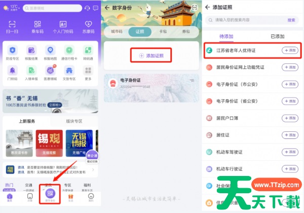 进入【数字身份】-【证照】页面,选择“添加证照”,在待添加列表中选择【江苏省老年人优待证】,点击“添加”按钮。
