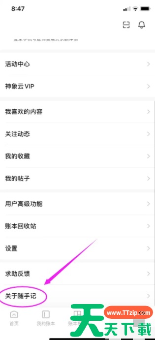 之后进入我的页面,点击左下角关于随手记。