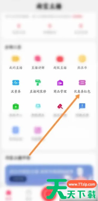 第一步,打开手机淘宝主播软件首页,点击下面的优惠劵红包图标。