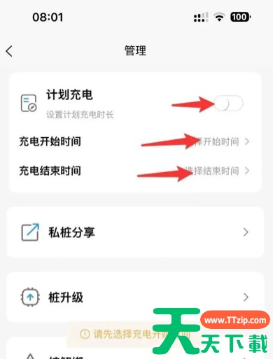 下载‘智享乐充’APP 2.登录 3.扫描充电桩上的二维码绑定设备 4.找到‘点击充电桩进入管理’ 5.计划充电中设置预约时间 @天天下载 除特别注明外,本站所有文章均为 天天下载 原创,转载请注明出处来自 https://www.ttzip.com/180733.html