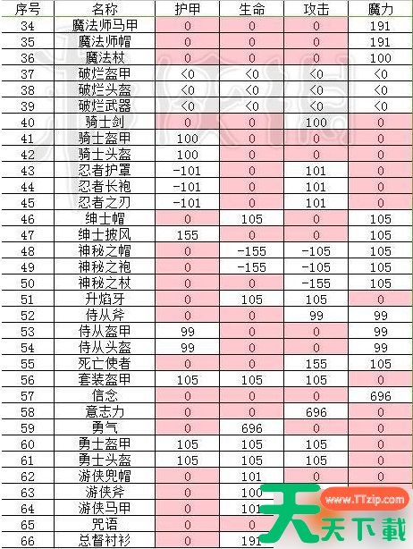 本列表出去隐藏装备为1级不可升级,以及破烂系列装备无法通过铁匠升级外,所有装备属性均为99级属性。