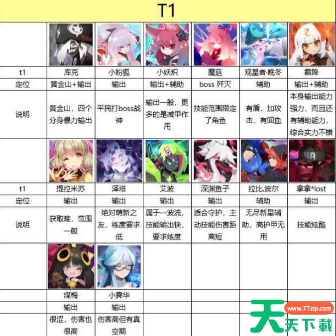 2、T1:库克、小粉狐、小妖炽、魔菇、观星者·晚冬、霜降、提拉米苏、泽塔、艾波、深渊鱼子、拉比·波尔、拿拿lost、煤梅、小霁华