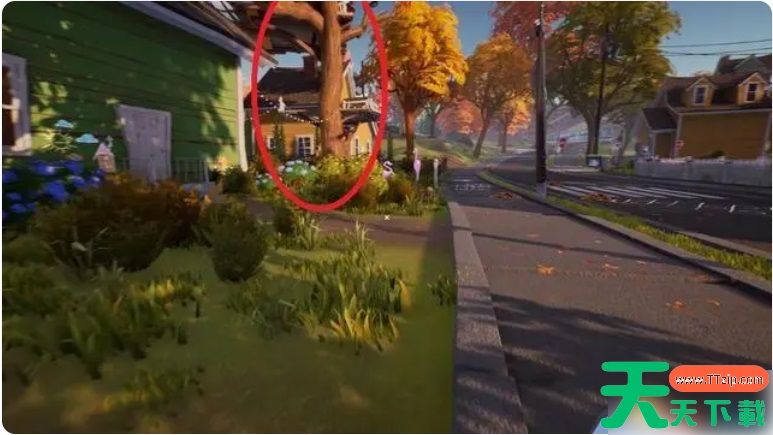 完成一楼的探索后,出门找到正对着蓝色房屋的树屋。