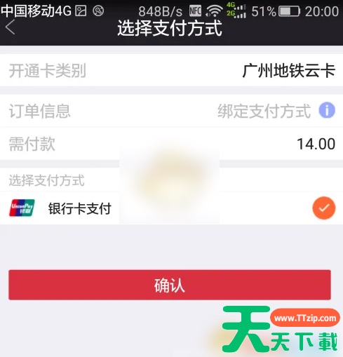 4、点击下面绑定银行卡并开通地铁云卡,确认相关信息,注意这里预付款14元