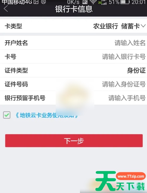 5、输入自己相关信息,包括开户名、卡号、身份证号,手机号等等,然后再一步