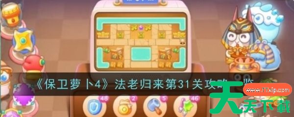 《保卫萝卜4》法老归来第31关中一共有9波怪物,玩家可以使用拳套和水晶这两种输出伤害较高的炮台快速击败敌人,有很多小伙伴不知道这一关怎么过,接下来就让天天下载软件站带大家一起来看看吧。