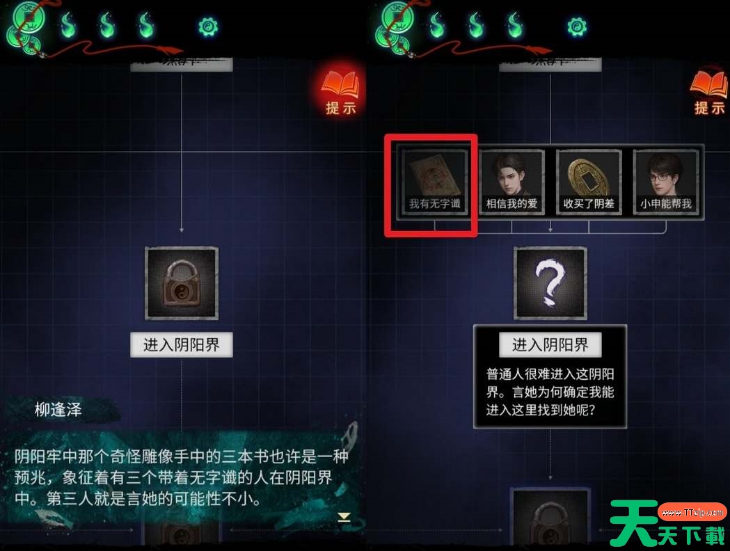 第一部分是她的目的,进入阴阳界上方所需的线索:无字谶-杜言她、照片-仪式用品、同道中人-杜言她。