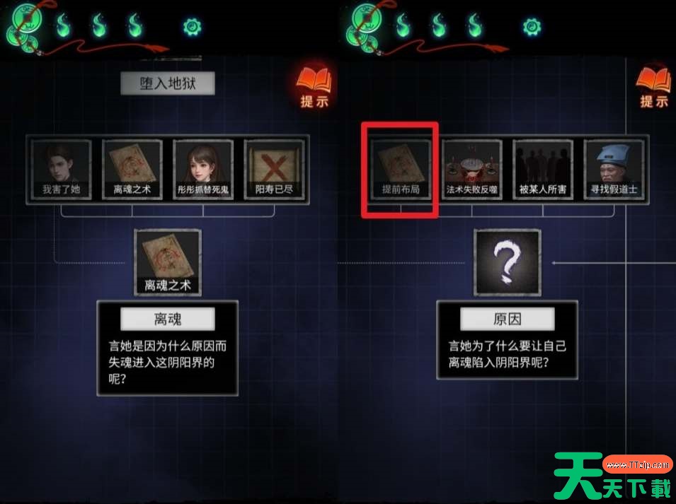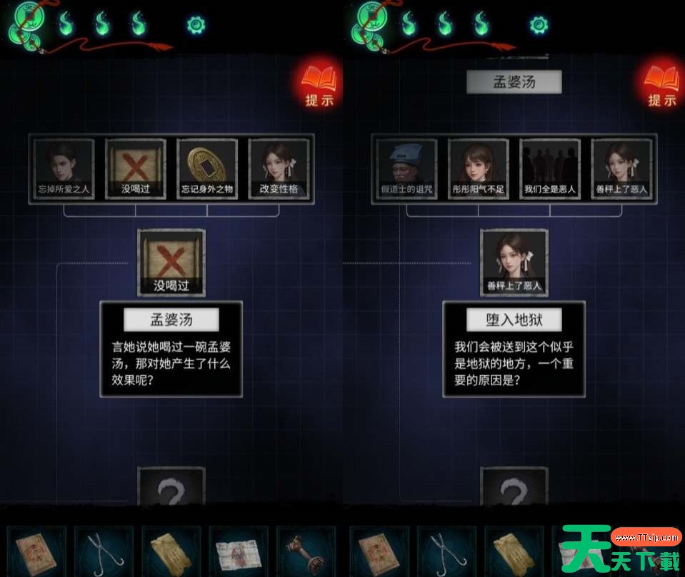 来到右侧的原因处提交线索:孟婆汤-没喝过、堕入地狱-善秤上站了恶人、离魂-离魂之术。