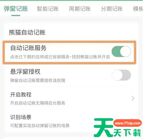 打开熊猫记账app,点击【我的】,如图所示 然后点击【自动记账】,如图所示 最后打开自动记账服务后的绿色开关即可,如图所示 @天天下载TTzip 除特别注明外,本站所有文章均为 天天下载 原创,转载请注明出处来自 https://www.ttzip.com/196052.html