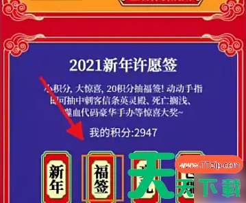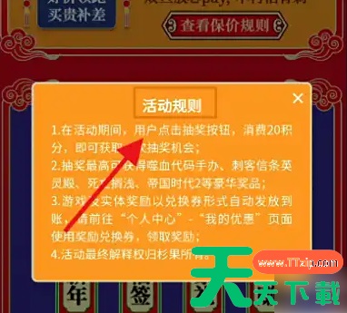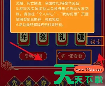 第一步,首先打开游戏,选择“元旦篇”。 第二步,然后点击“杉果双旦大促”活动。 第三步,再选择“福签”。 第四步,接着打开“活动规则”。 第五步,然后选择“拿一张看看”,获得“福卡”。 第六步,最后使用“福卡”,就可以激活福袋了。 @天天下载TTzip 除特别注明外,本站所有文章均为 天天下载 原创,转载请注明出处来自 https://www.ttzip.com/196491.html