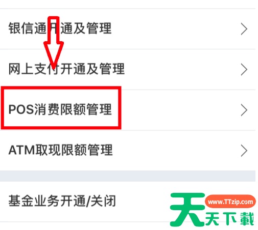 点击“业务开通/关闭”——“POS消费限额管理”,进入“POS消费限额管理”。