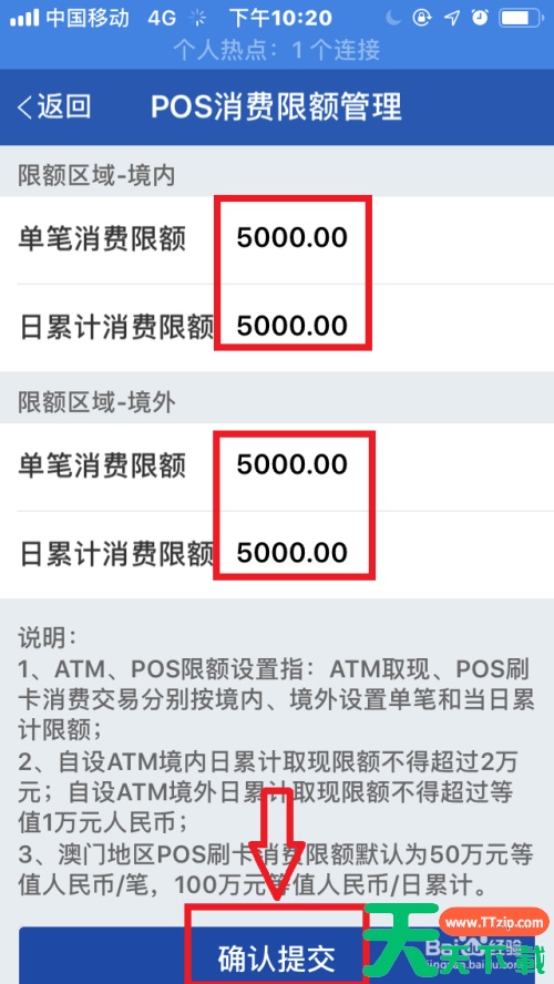 点击“设置”——输入境内外POS消费限额——“确认提交”,选择短信动态密码进行身份验证,即可完成设置“POS限额””。