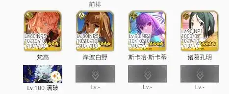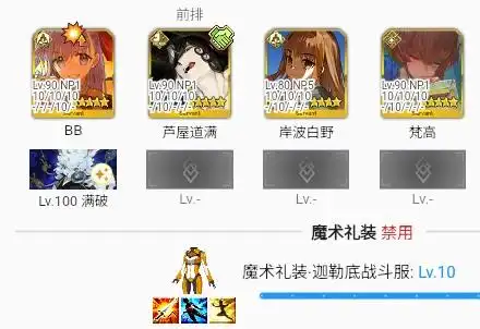 T1:白野3后刷出水BB至少1张红卡+其他卡后换梵高,道满23,梵高231给水BB,水BB全技能,道满+梵高宝具+水BB红卡