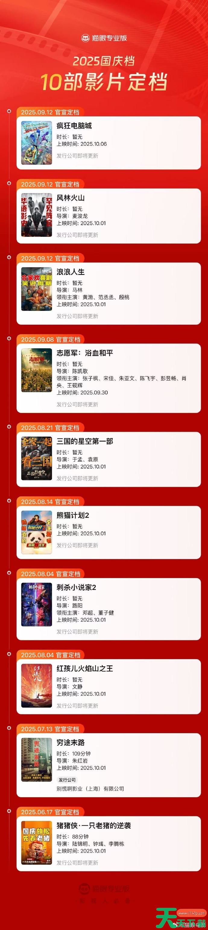2025年的国庆节马上就要到了,很多大片都排好了档期,大家一定都很期待有哪些作品,下面天天下载为大家带来2025国庆档新片阵容,感兴趣的小伙伴一起了解一下吧。