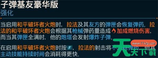 子弹基友豪华版:增加火焰伤害与弹药回复,可换取短时间无限弹药,是终结精英敌人的爆发手段。