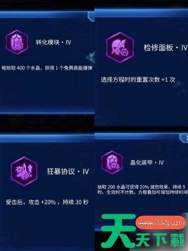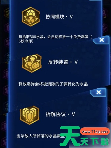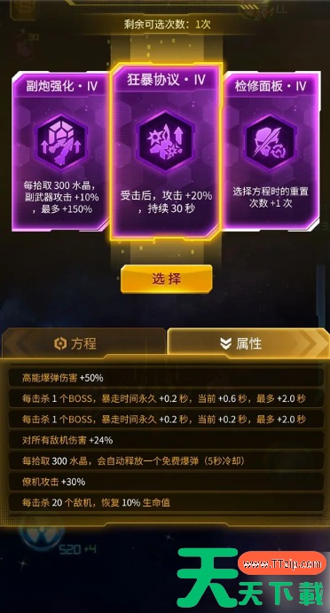 3、玩法:拿到狂暴协议,开始撞敌机子弹进行叠层,永世决意的被动,60%血量受击,不会一击必杀,所以,受击之后,击杀敌机,吃水晶进行回血,血量补足60%则再次受击,基本上40层就可以无痛过100波炼狱魔神,如果受击过程中不慎死亡,直接退掉游戏删除后台,重新进入,可以回到复活之前继续玩,前期尽量多拿回血与免伤,40%以上的回血,就足够叠层,免伤最高可叠76%,70以上的免伤,有比较大的概率可以受击四五次不掉血,对比回血受击,叠层会快很多,同时面对难打的boss,有更高的容错率,遇到boss在30秒内无法击杀时,必要可以死了复活,继续叠层,确保叠层不断,同时转换协议很重要,转换协议可以把敌方的弹幕变成水晶,当血量不足时,使用爆弹转水晶,可以补充血量,方便继续叠层,拆解协议提供的+50%水晶,可以让你更快升级,与回血,基本等于增加50%经验值,前期如果拿到,可以提供更多等级,可以选更多方程,其次就是新手战力低的,前期可以拿一些增伤方程,比如boss增伤,全体增伤,战机僚机副武器增伤,但主要还是以回血与免伤为主,其次就是爆弹CD,基本叠够300层左右,就可以通过333波,拿走全部奖励