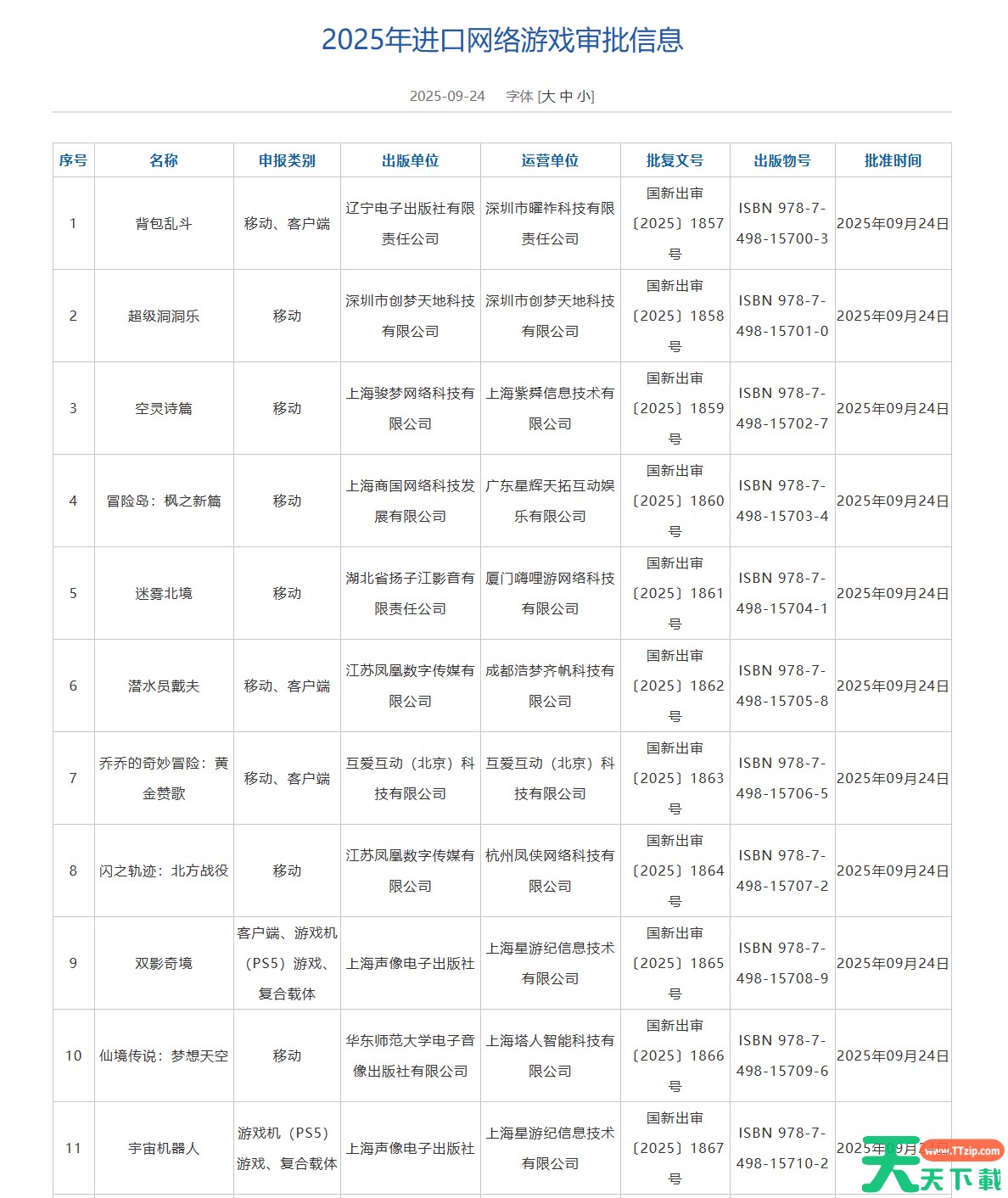 2025年9月进口游戏过审分享都已经在上面,感兴趣的小伙伴可以参考本篇攻略,希望能为各位玩家们带来帮助,想要了解更多游戏攻略及资讯请持续关注天天下载(ttzip.com)。