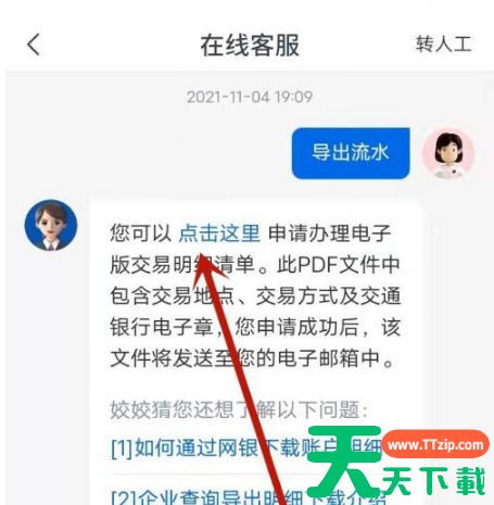 点击客服 交通银行app点击右上角客服头像。 发送问题 发送导出流水的问题,查看客服回复。 开立清单 点击去开立交易明细清单。 查看流水 阅读协议确认开立,申请查看电子流水清单。 导出邮箱 选择电子版流水清单导出于输入的邮箱地址。 @天天下载TTzip 除特别注明外,本站所有文章均为 天天下载 原创,转载请注明出处来自 https://www.ttzip.com/197427.html