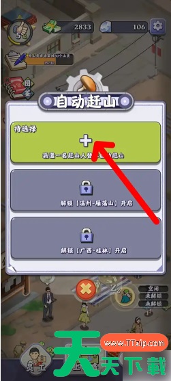 首先,打开游戏页面,点击自动赶山图标 然后,在自动干山页面,点击加号派遣赶山人 最后,点击选择空闲的员工,安排自动赶山即可。 @天天下载TTzip 除特别注明外,本站所有文章均为 天天下载 原创,转载请注明出处来自 https://www.ttzip.com/197489.html