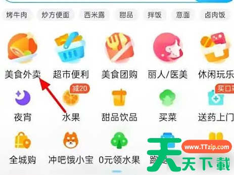 1、首先打开饿了么APP,然后点击上方的美食外卖选项。