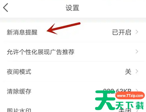 点击界面右下方我的 点击设置按钮 点击新消息提醒 点击箭头指向的按钮 @天天下载TTzip 除特别注明外,本站所有文章均为 天天下载 原创,转载请注明出处来自 https://www.ttzip.com/197736.html