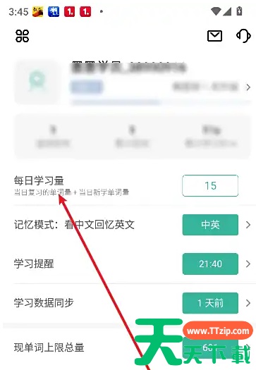 第一步,打开墨墨背单词,点击【我的】 第二步,打开页面,找到【每日学习量】 第三步,打开相关界面,在方框内输入数字修改学习量 @天天下载TTzip 除特别注明外,本站所有文章均为 天天下载 原创,转载请注明出处来自 https://www.ttzip.com/197787.html