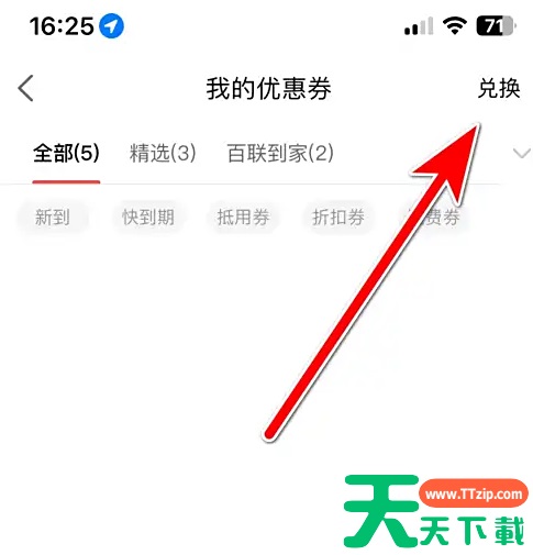 第一步:打开i百联的首页,点击【我的】选项。 第二步:选择【优惠券】。 第三步:点击【兑换】选项。 第四步:输入兑换码后,点击【确定】即可兑换优惠券。 @天天下载TTzip 除特别注明外,本站所有文章均为 天天下载 原创,转载请注明出处来自 https://www.ttzip.com/197799.html