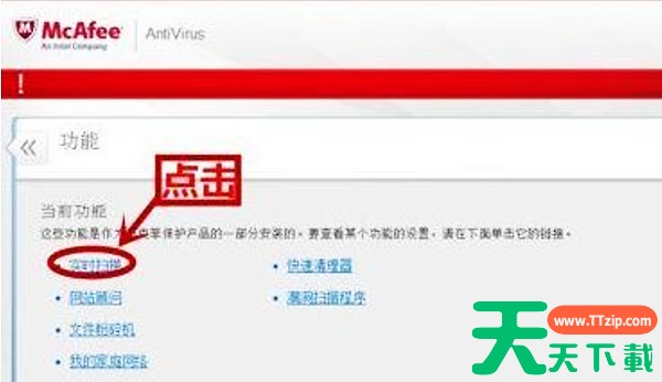 1、打开mcafee软件,点击“导航“,接着在导航中心点击“功能”按钮,在“功能”页面下,点击“实时扫描”按钮。